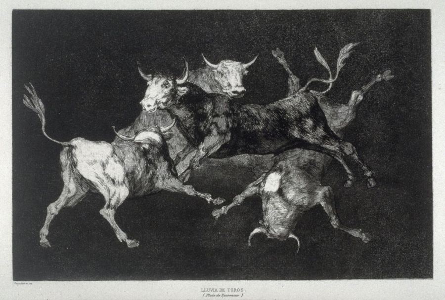 Para el caso en la exposición podemos ver uno de los más hermosos grabados del español, el mal titulado Lluvia de toros; mal titulado, porque está claro que los toros en esta imagen no están cayendo, no es un movimiento de precipitación de arriba hacia abajo lo cual es la definición mínima de lluvia, por el contrario, son toros jugando, o en portugués, brincando (Goya no puso título a la gran mayoría de sus grabados, esa fue decisión muy posterior de los editores, que en la mayoría de las ocasiones más que orientar determina de una manera simplista el amplio sentido irónico de las imágenes de Goya). La de los toros jugando es una escena que no podríamos ver en la naturaleza porque los toros no chocan entre sí como hacen los felinos y los caninos para divertirse, es de parte del artista un acomodo expresivo de su manera de resolver una composición, de resolver un complejo figura y fondo con apenas tres texturas, un divertimento prueba de que un maestro no reduce su identidad a dos tres rasgos.