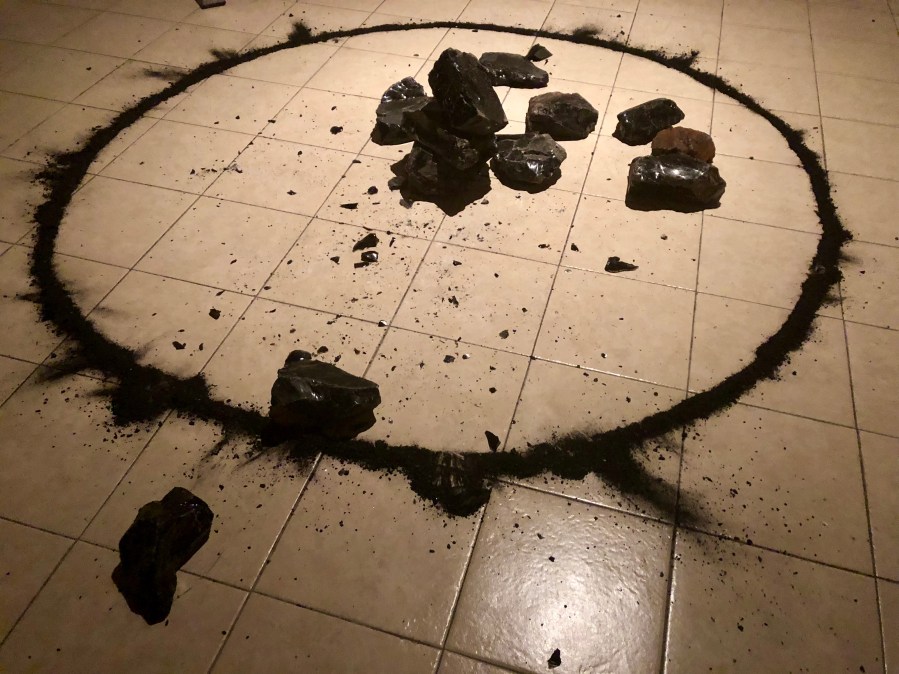El pasado jueves 22 en No Automático, el espacio independiente organizado por Eliud Nava, Alejandro Zertuche presentó una serie de trabajos con obsidiana: una escultura efímera al centro de un círculo de carbón, un grupo de dibujos al carbón de diferentes especímenes de la piedra semipreciosa, una pintura del sol negro dividida en cinco cuadros, y un espejo de obsidiana que era percutido por una pequeña maquinaria.