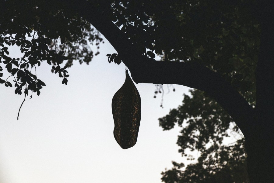 La pieza de Tahanny se encontraba desplegada en una de las partes mejor arboladas de la Macroplaza, colgando de las ramas había 50 hojas de latón golpeado, martillado en forma de hojas de árboles y bajo los árboles 50 personas de distintas edades, que al escuchar la señal de un silbato lejano se reclinaron sobre el césped buscando las hojas que el otoño ya había empezado desprender y haciéndolas crujir entre los dedos, a la segunda señal del silbato se incorporaron para hacer sonar los troncos de los árboles, percutiendo, pasando la palma de la mano por la rugosidades, en la tercera señal, el corazón de la pieza, tomaron largas varas para hacer sonar las hojas de latón, cada quien con su ritmo de niños, adultos, de la juventud adolescente, de escucharse entre sí, la improvisación la forma musical más cercana al naturaleza probablemente. Al final, como si se tratara de una forma sonata, el silbato marcó la cuarta y última vez para que los participantes dejaran las varas y se volvieran a inclinar sobre el césped en busca de las hojas completando el ciclo de la naturaleza, volviendo a la pérdida crujiente revelándose como la dura victoria de la especie. El despliegue corporal y acústico coincidió con la puesta del sol, empezando con la luz natural hasta acabar con la luz mercurial de la plaza. Biophilia sin duda, arte público también, porque Bios en griego clásico designa todo aquello que crece, y Philia es literalmente la inclinación por conocer aquello que se ama, que se levanta de la tierra para volver a ella.