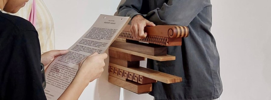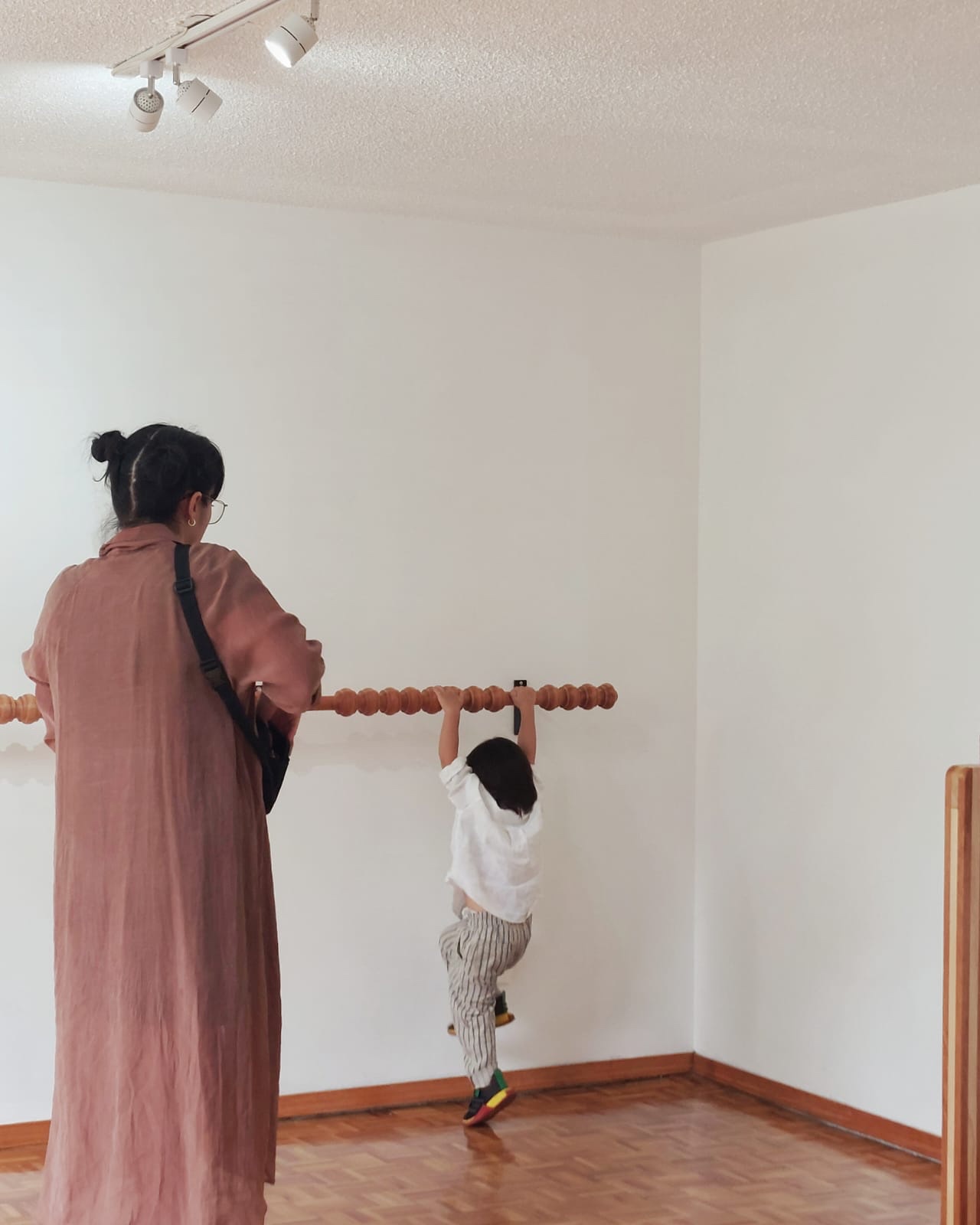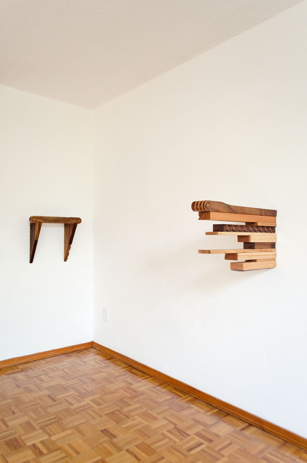 “Aquí nomás”, la exposición en Nixxxon de Beth Calzado Michel, es un conjunto de superficies para descansar el cuerpo, repisas repensadas, un barandal que en una vida pasada fue una barra de ballet, un fragmento de reclinatorio para las desdichas de la fe, trabajo que la artista ha venido pensando y reformulando desde hace algunos años, con la consecuencia de que ahora la forma es más elaborada pero más sencilla de entender. De hecho, el concepto escultórico y de carpintería fina de los objetos de Beth no es ideal para la limpieza y neutralidad de un cubo blanco, que usualmente facilita la comprensión del arte contemporáneo; creo que en el caso de Beth, el espacio en blanco puede hasta dificultar lo intuitivo de sus objetos escultóricos, que además de tener la ventaja de ser directos en su mensaje y la aún mayor ventaja de que no nos tenemos que aguantar las ganas de agarrarlos, tienen la virtud de una astucia conceptual que se entiende práctica y perfectamente en cualquier lugar cotidiano imaginable, público y privado, la iglesia y el metro, el banco y la sala de una casa. Flexibilidad para nada común, y Beth la logra con la mano en la cintura.