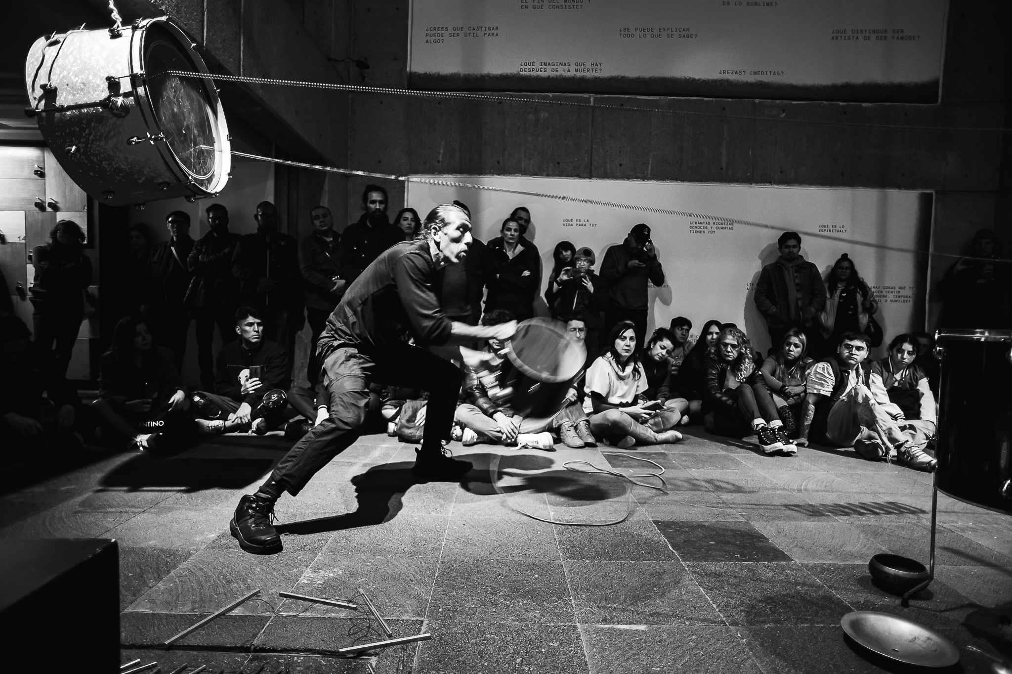 A unas calles del Ex Teresa se presentó esa misma noche el montaje de “Membranas Espirales”, en el Centro Cultural de España, bajo la curaduría de Cinthya García Leyva, invitada por la institución bajo la curiosísima consigna de que las propuestas sucedieran fuera de los espacios que naturalmente se entienden como auditorios. Es inusual la convocatoria de una institución para que se la trate de manera poco convencional, y Cinthya tiene un largo y serio trayecto académico pensando la naturaleza de la huella sonora y cómo ésta se aloja en el cuerpo y la experiencia compartida. Para su curaduría se concentró en pensar las relaciones físicas, las texturas de los espacios, el flujo de los públicos en el uso de las escaleras, en transitar los espacios no considerados escenarios, problemas que fueron soluciones para hacerlos parte de la pieza por parte de Milo Taméz y Jerónimo Naranjo con el equipo museográfico del centro cultural. “Membranas Espirales” es una instalación que se desprende de “La batería suspendida”, obra concebida por Jerónimo con Milo en mente, desarmar la batería para expandirla mediante cables y resortes por todo el lugar. La energía que requiere tocar el instrumento-instalación, agacharse acá, salir corriendo para brincar y tocar allá, es claramente un reflejo del cómo Jerónimo interpreta la fisicalidad de Milo, que ha incorporado en su persona una extensa y consistente investigación para emancipar la percusión del sujeto sentado que se limita a marcar un ritmo, para abrir la sonoridad de la batería a las voces que originalmente fueron.
