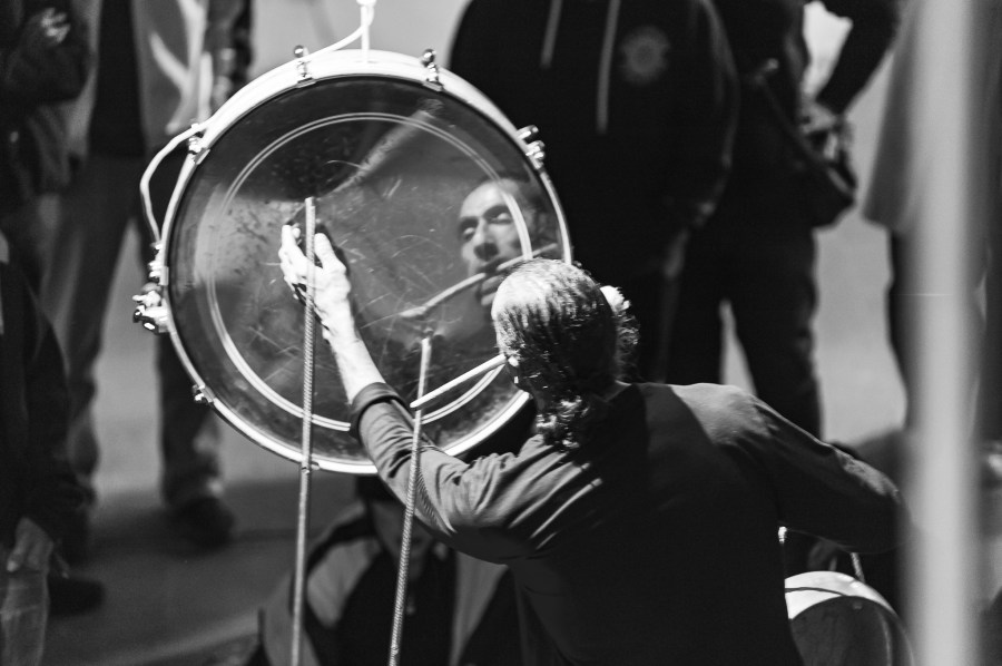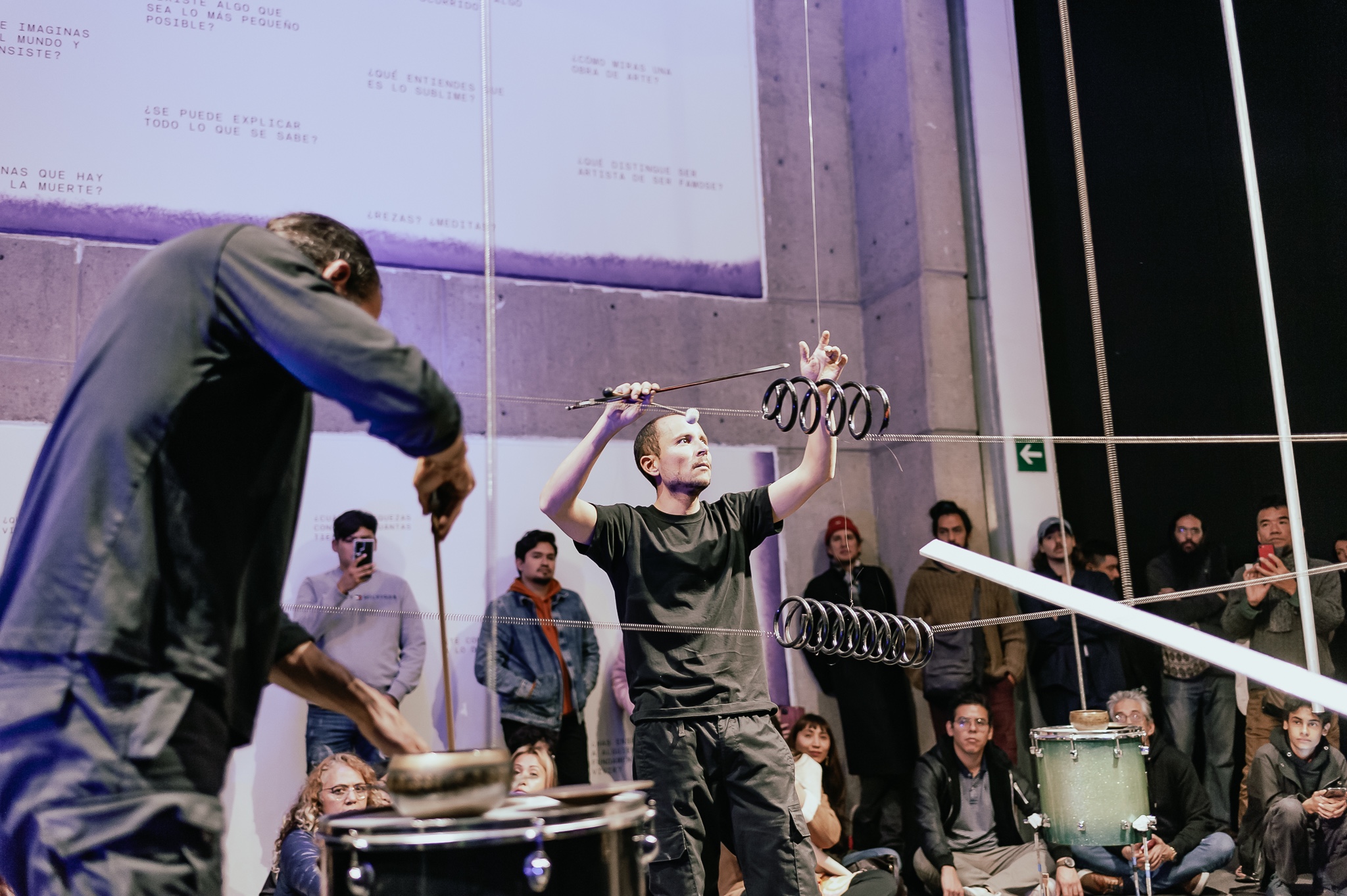 El concierto comenzó cuando desde el quinto piso del centro cultural descendió un tumulto que parecía un redoble de tambores si tal cosa pudiera ser posible sin percutir la membrana. Es la invención de los resortes que sostenían y atravezaban las tarolas que, al ser tocados, estirados, arrastrados por la textura de los pisos, hacían murmurar las membranas en un espectro armónico amplio y correlón por todo el edificio, del que Milo y Jerónimo hicieron uso en barandales, estructuras metálicas de los polines que sostienen las escaleras, glissando los cables tensados de los que suspendían las diversas partes del instrumento con arcos de cuerda. Nada más efectivo y punk para sacudir los más acendrados prejuicios musicales que poner en jaque la lógica de un auditorio, manifestando la naturaleza arquitectónica de un edificio, en la que mientras permanezca invisibilizada la función jerárquica de pisos y butacas, escaleras y puertas, siempre permanecerá agazapado y discreto el subterfugio del poder político.