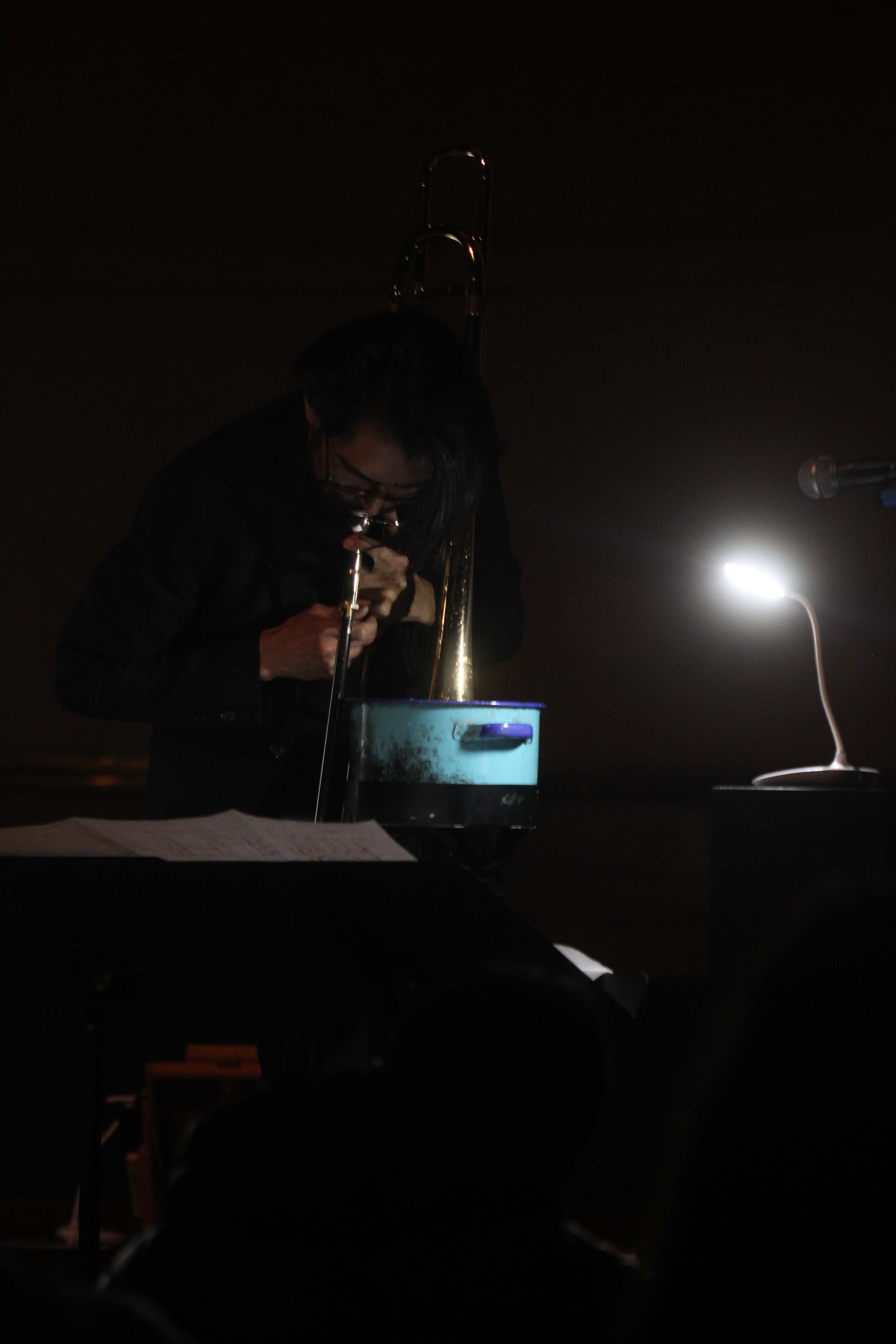 El dueto de Alex Bruck y Xavier Frausto tuvo problemas para arrancar, y luego para seguir. El trombón es un animal domesticado a medias y Bruck parecía no preocuparse mucho de que la viola canta emocionada de sí misma cuando no tiene que servir de puente. Frausto se enteró y optó por recurrir a las posibilidades percutivas más discretas de la campana del trombón chocando con la vara de extensión, tratando de encontrarse con el vuelo de Bruck, que seguía feliz y despreocupado de lo que pasaba a su alrededor; creo que no lograron la conjunción interesante que pudo haber sido entre una viola y un trombón, pero sea como sea uno algo aprende, porque el error no existe, y a mí me ha tomado algo de tiempo comprender que después de la emancipación de la disonancia lo que ha seguido es la emancipación del accidente, y lo que resta es la experiencia musical en ausencia de toda moral institucional, que en el fondo no podría ser más que radicalmente política porque no hay manera de que ningún poder pueda asirla. Esta es la forma musical que permite que sin importar la proveniencia de cada integrante se puedan encontrar en aquello que la crítica tradicional, con una insuficiencia de conceptos en la que reconozco los signos de la represión sexual, indecentemente llama ruido.