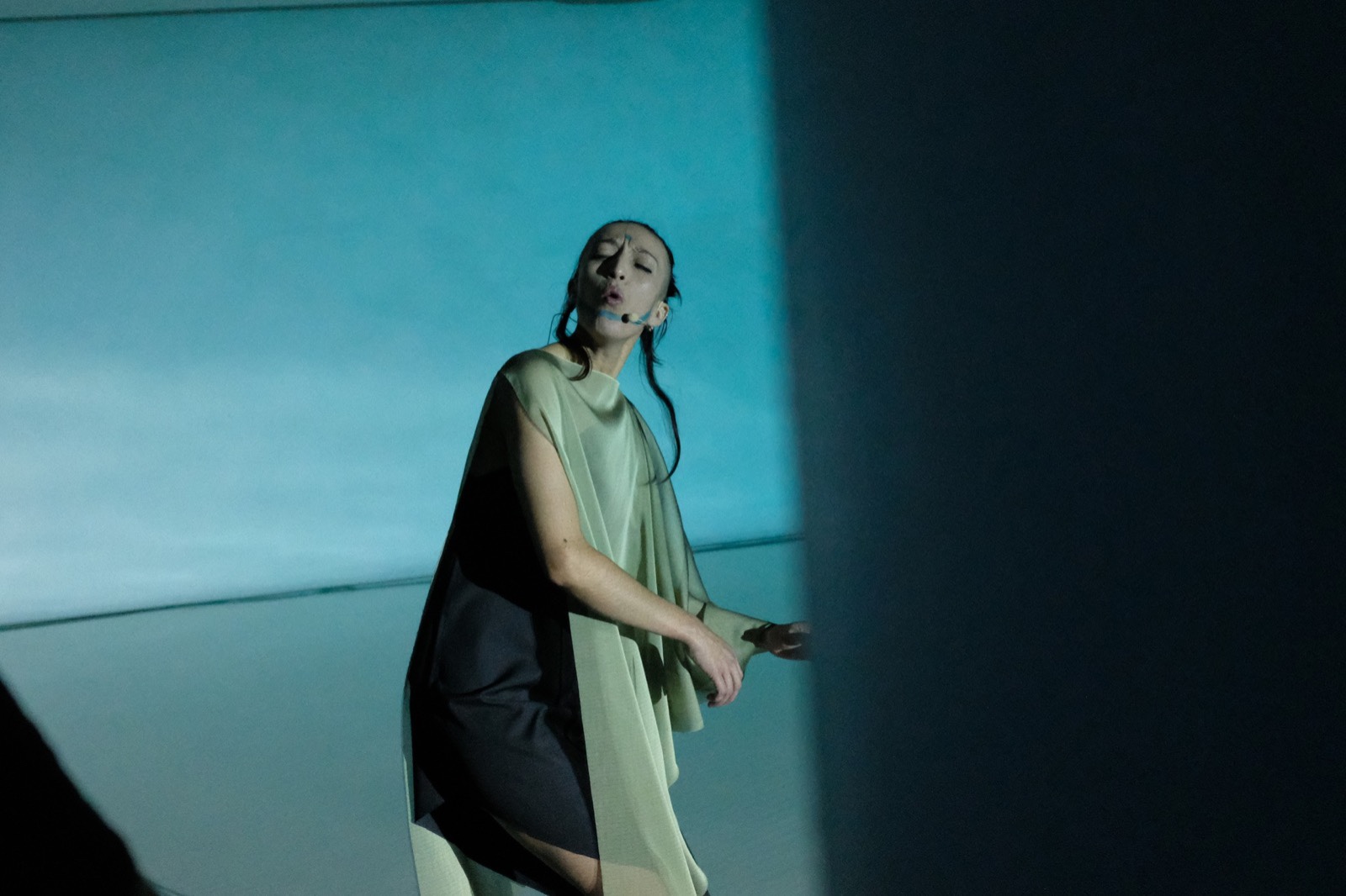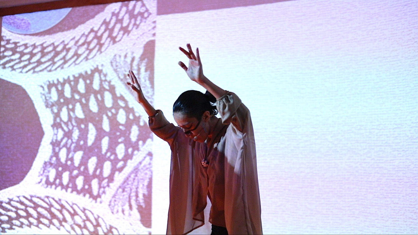 Reo, la obra presentada a la siguiente noche del jueves en el mismo auditorio, debe ser la obra más inaccesible del ciclo, requiere de parte de la audiencia un compromiso casi wagneriano, pero las razones son importantes: El tema es el pez. ¿Cuál es el habla de los peces? El paso de Athene Noctua a Reo es consecuente: entre el aleteo del ave y aleteo del pez la diferencia es apenas de densidad en la fluidez elemental; pero el viaje de la memoria hacia nuestro pasado marítimo es de millones de años, cientos de miles de millones, que recordamos verosímilmente en la placenta, que olvidamos en el primer instante en que el oxígeno entra a los pulmones y nace la voz. Los sonidos que produce Sarmen dentro de su cuerpo y que apenas exceden el límite de la cavidad bucal serían inaudibles e intransmisibles sin los procesos electrónicos a los que recurre en Reo. Es muy difícil saber cuándo el sonido es sólo de su aparato fonador y cuándo es transducción electrónica, y los escuchas, por tendencia o por prejuicio, queremos distinguir un caso del otro; en Reo, en oposición a Athene Noctua, el recurso electrónico y los visuales son parte fundamental de la fortuna en la transmisión de un sentido. Los sonidos de movimiento diafragmático, turbulencias y labios en una práctica ausencia de vocales durante toda la obra que dura casi media hora, a Sarmen se le desarrollan las agallas necesarias para respirar oxígeno en ausencia de aire, para lograr una sensación de profundidad aérea, flotante, donde el sonido viaja en burbujas y frecuencias dimensionales envolventes, hacia el final aparece una sola vocal: äoü, para cerrar las famosas agallas de Sarmen Almond para aventarse a un proyecto de esta naturaleza.
