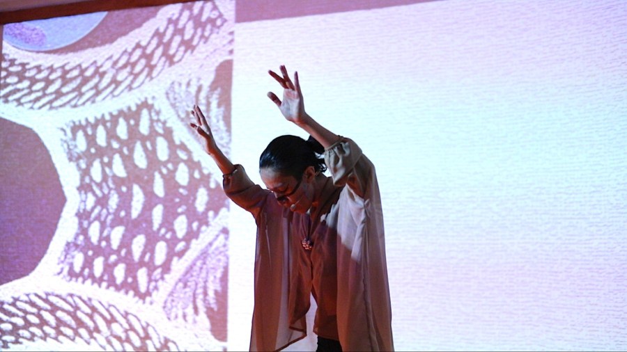 Ophidia, presentada la noche del sábado, es el nombre de la taxonomía moderna para el grupo de serpientes que abarca desde las reptantes terrestres hasta las más pequeñas acuáticas, es para Sarmen también la vibración de la Tierra que se presiente desde la matriz como un índice de las fuerzas del suelo y sus conmociones: el sonido sibilante de la lengua con la que el órgano sensible de la serpiente percibe las temperaturas y las vibraciones mínimas circundantes y sobre todo el órgano sensorial más grande de todos: la piel. En la obra de Ophidia no hay imágenes acompañantes, y los sonidos registrados de campo son congruentes con el reptar y undulación de la columna de Sarmen que comienza desde la punta de los pies hasta el parietal del cráneo en una línea continua, culminando en consonantes de “m” y “s” alternados con exhalaciones provenientes de lo más profundo del vientre. Durante el performance la artista se arrastra con la planta de los pies, repta y se desliza entre el público sentado disperso sobre el piso (de ahí que las imágenes proyectadas hayan sido innecesarias, porque la imagen éramos los presentes). El punto climático vocal, a la mitad del desarrollo, aparece como una irrupción cuando vuelve a alcanzar reptando el centro del escenario y abre la boca para dejar salir un eco cavernoso, gutural y nasal que se apodera animal de la obra determinando la transformación de su cuerpo y ser en una creatura que es toda columna vertebral, babeando un rastro que llega, por fin, a una subida vocal hacia las notas más altas, sólo para volver a las consonantes craquelantes del paladar y las ululantes de los labios apretándose, sonidos siseantes de hierba y ramitas quebradas al pasar con el viento corriendo sus trayectos por encima, la fuerza del sonido de un cuerpo arrancada del piso y jalada de la atmósfera.
