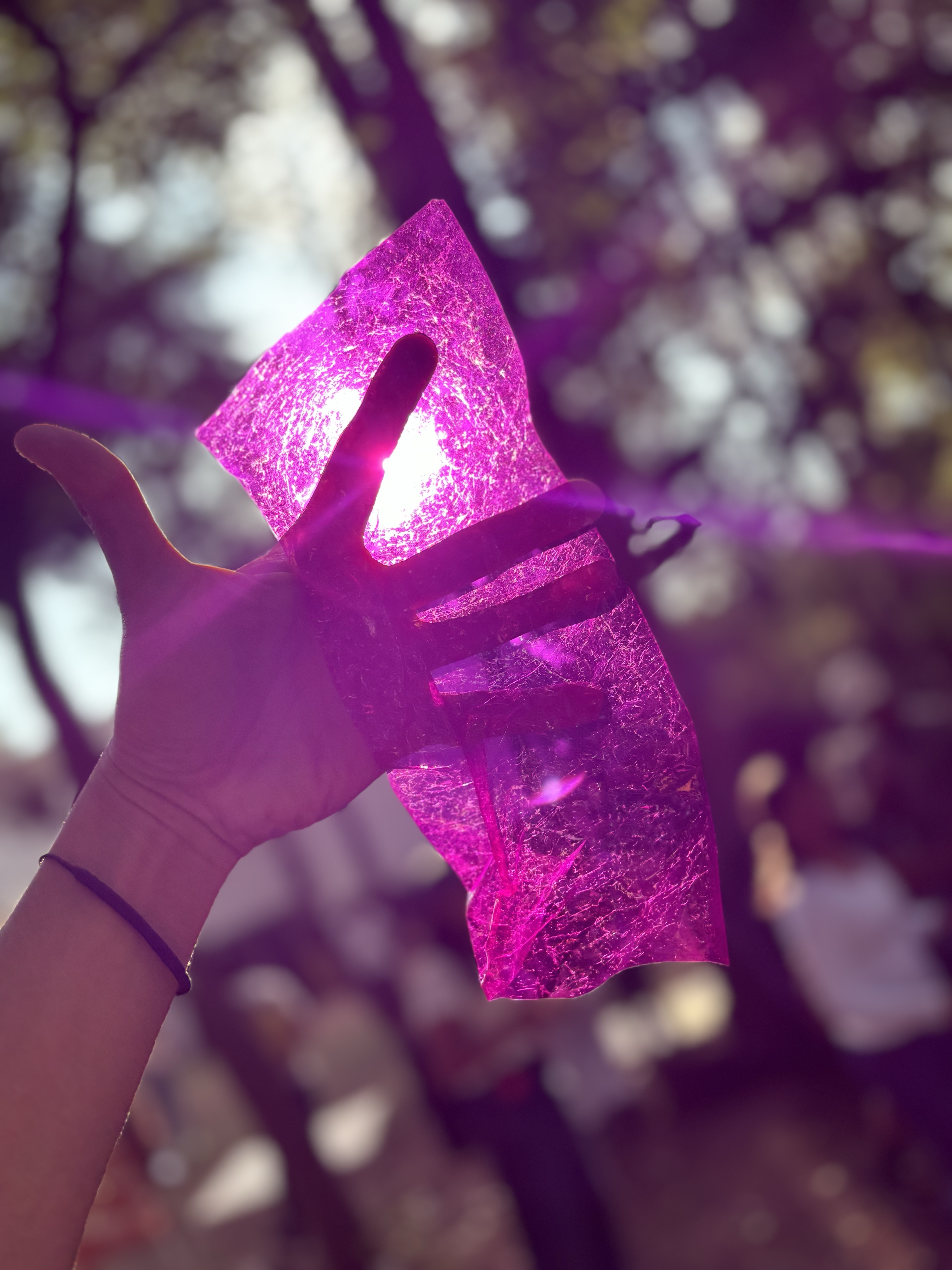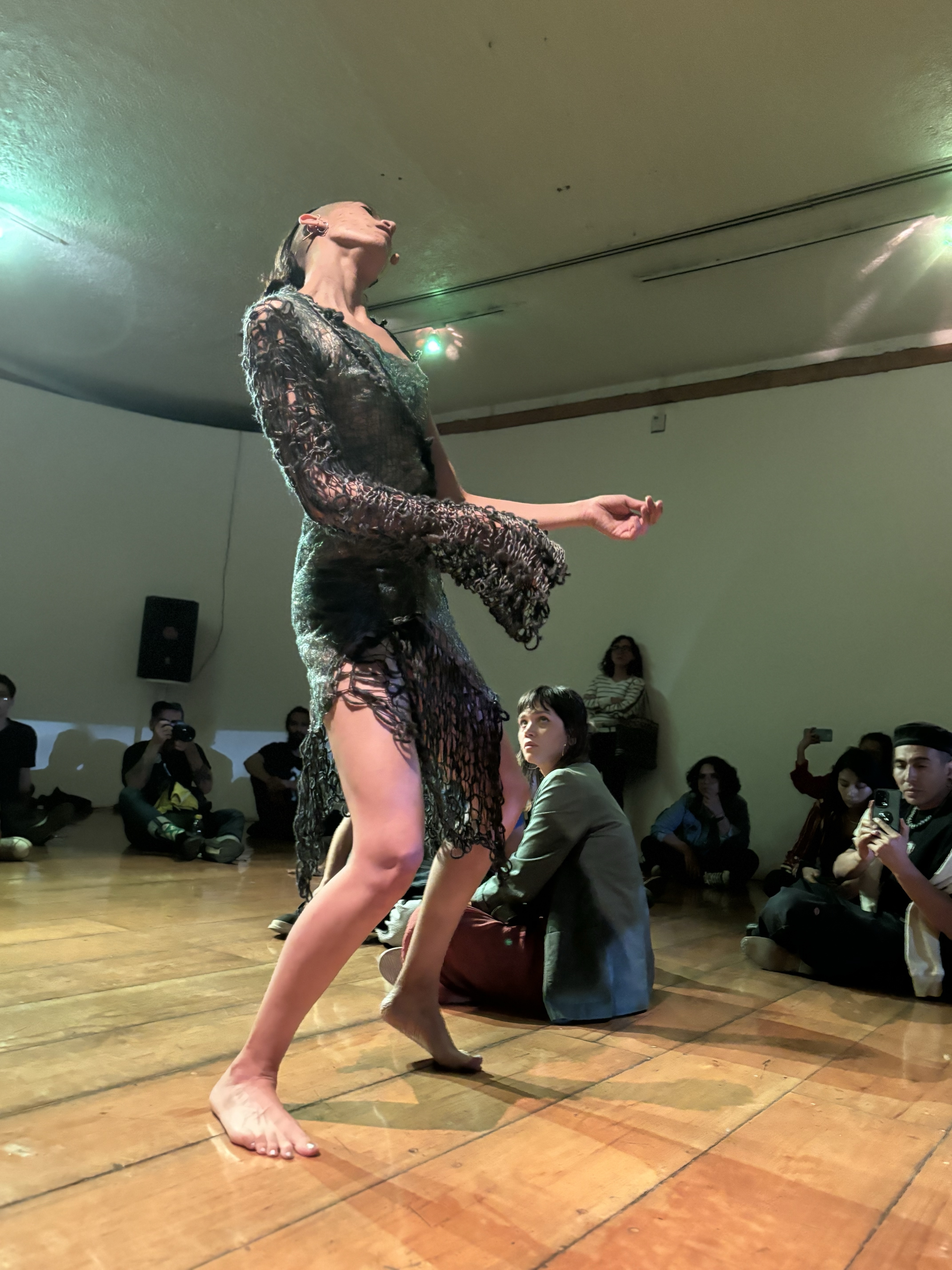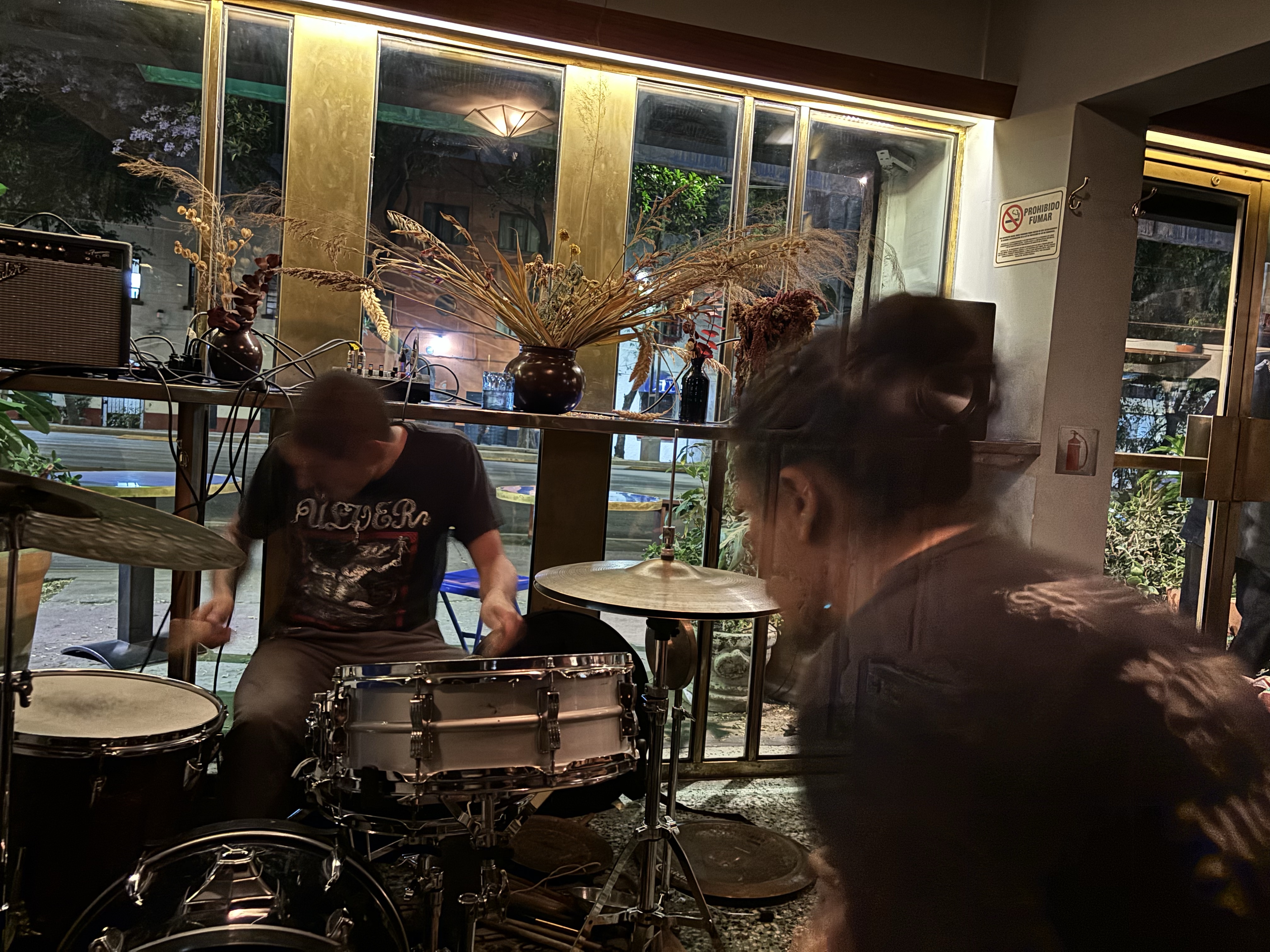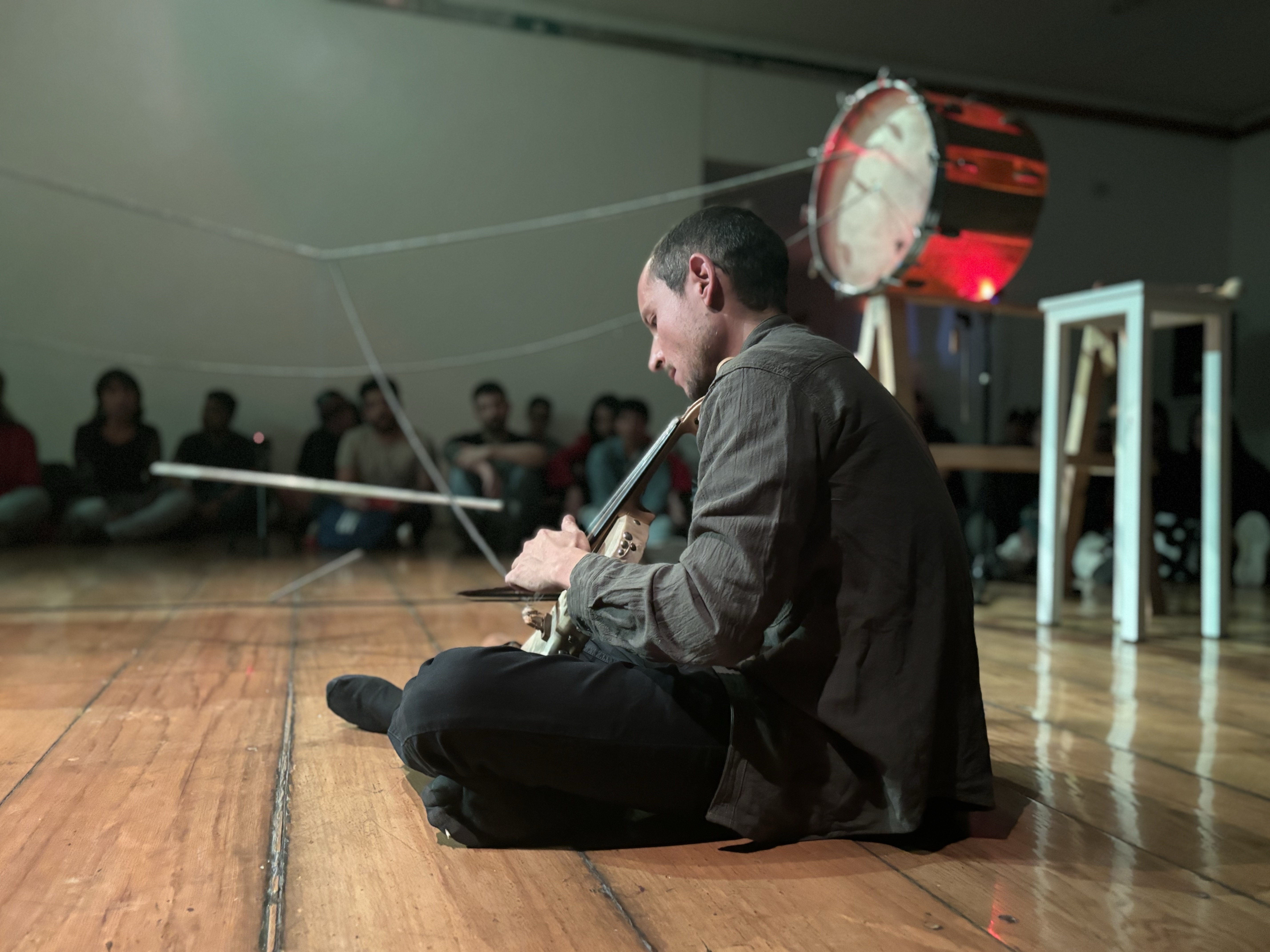 Visual, por parte de Jerónimo, porque su comprensión de lo que es un instrumento musical linda con los parámetros de la ya mencionada instalación, que subraya del instrumento, percusivo en este caso, cualidades escultóricas, como objetos de arte que uno podría tener en su casa en una convivencia cotidiana, y que le permiten a Jerónimo abrir la anatomía del instrumento para encontrar sus fibras en un uso de capacidades armónicas de otra manera insospechadas. Las vibraciones entre subacústicas y los timbres como electrónicos en la membrana de los tambores de una batería, tensadas por cables y resortes, son el producto de un estudio, de una observación de la naturaleza sensible del instrumento, una disectación sensible, intelectual y delicada, que pone en crisis la historia del instrumento y del cómo lo concebimos. Jerónimo se movía entre un extremo y el otro de ambos tambores tensados, estimulando los cables y los resortes, y creo que delatando un interés geométrico por la línea en sí, haciendo evidente que las líneas entrecruzándose y temblando son el sonido en sí, una manifestación material, como si el amor por el sonido fuera indistinto de su fuente física, de su naturaleza de frecuencia vibratoria. Al final, Jerónimo ejecutó un solo de violín, instrumento también construido por él mismo y que en lugar de caja de resonancia estuvo ligado por los cables a las membranas de los tambores, tocado entre las piernas a la manera de un rebab, evocando de lejos los armónicos de medio oriente e iluminado por luces rojas, melancólicos pero casi rabiosos, en una protesta política por el genocidio que actualmente se lleva a cabo en Palestina, sobre la franja de Gaza.