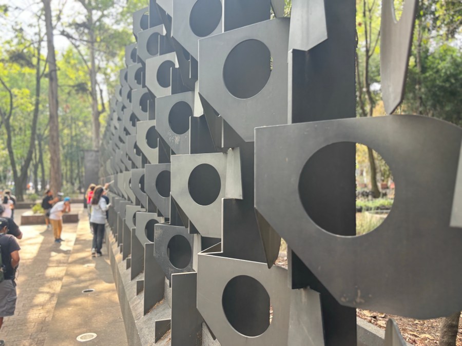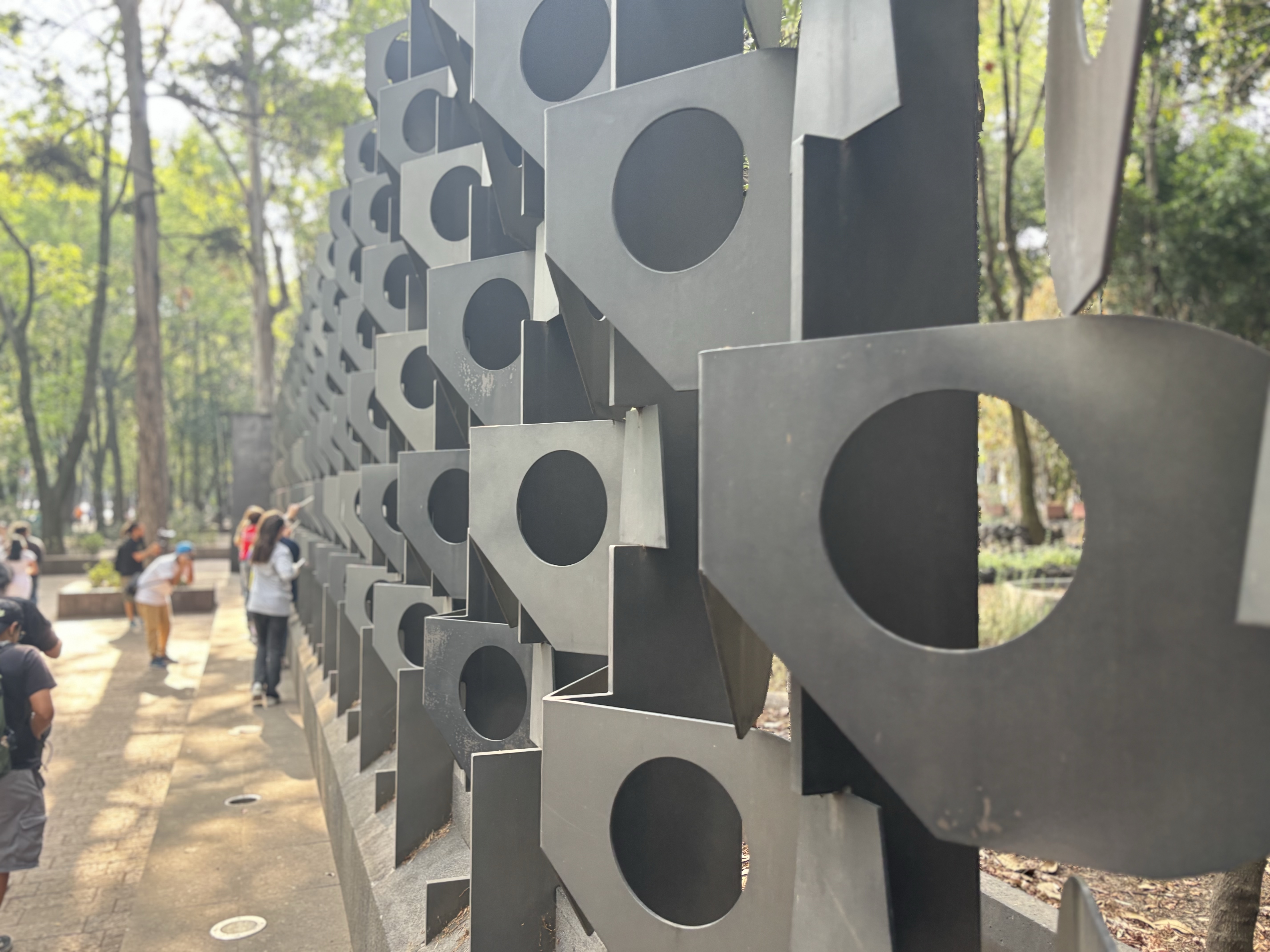 En el pabellón del museo Tamayo, que se encuentra ya en los jardines del museo que lo conectan con el bosque de Chapultepec, los asistentes nos reunimos alrededor del grupo de niños, en unos altoparlantes portátiles empezó a sonar la grabación de las voces de los niños como un murmullo contenido de secretos revelados, y empezaron a jugar a la fricción sonora con pedacitos de papel celofán, como un eco del crujir de los secretos en voz baja dictados al oído, el papel celofán tan colorido y transparente y el ruido tan distintivo de los dulces que se abren. Los niños estaban, por supuesto, improvisando lo que hacían, y es muy notorio el gesto que es espontáneo (¿es eso la infancia, una predisposición a improvisar? ¿Es eso lo que nos asusta de la infancia, su impredictibilidad?). Empezamos un recorrido por el bosque, siguiéndolos bajo la pauta de los artistas y todos los presentes rodeándolos como instintivamente (tal vez un aprendizaje heredado de nuestra antigua coevolución con los lobos, los lobos piensan que los cachorros deben protegerse a toda costa, y los ubican siempre al centro del grupo durante los trayectos). De pronto los niños se detuvieron en una parte del bosque, las bocinas callaron, y los niños con unos conos apoyados en el oído se dedicaron a escuchar, escuchar el sonido de los alrededores, del suelo, de sus propias pisadas, del viento que traía el vaivén como de una marea en el tráfico cercano del Paseo de la Reforma, y naturalmente, cuando alguien se detiene y se pone a escuchar quién sabe qué, uno espejea la acción (¿es eso la infancia? ¿Un recuerdo de que no todo está nombrado?). Creo que uno de los momentos más brillantes y culminantes fue cuando llegamos al Museo de Antropología, inmenso y pétreo y todo lo contrario de la niñez, monumento a la seriedad y rodeado por una reja metálica y gris, claro símbolo de todas las cosas feas de la civilización occidental. Los niños se subieron al soporte de la reja que se extiende a lo largo de la avenida y empezaron a recorrerla, con la ayuda de palitos en las manos usándo la reja como un gran instrumento de percusión, con ese sencillo gesto deshaciendo momentánea pero muy efectivamente el símbolo de la opresión y el despojo, demostrándonos, momentánea pero contundentemente, lo ilusorio del poder. El trayecto terminó, después de correderas y descansos, en los jardines de la Casa del Lago, donde los niños capitularon soplando con popotes en contenedores de agua, dirigiéndose entre ellos mismos la orquestación del borboteo.