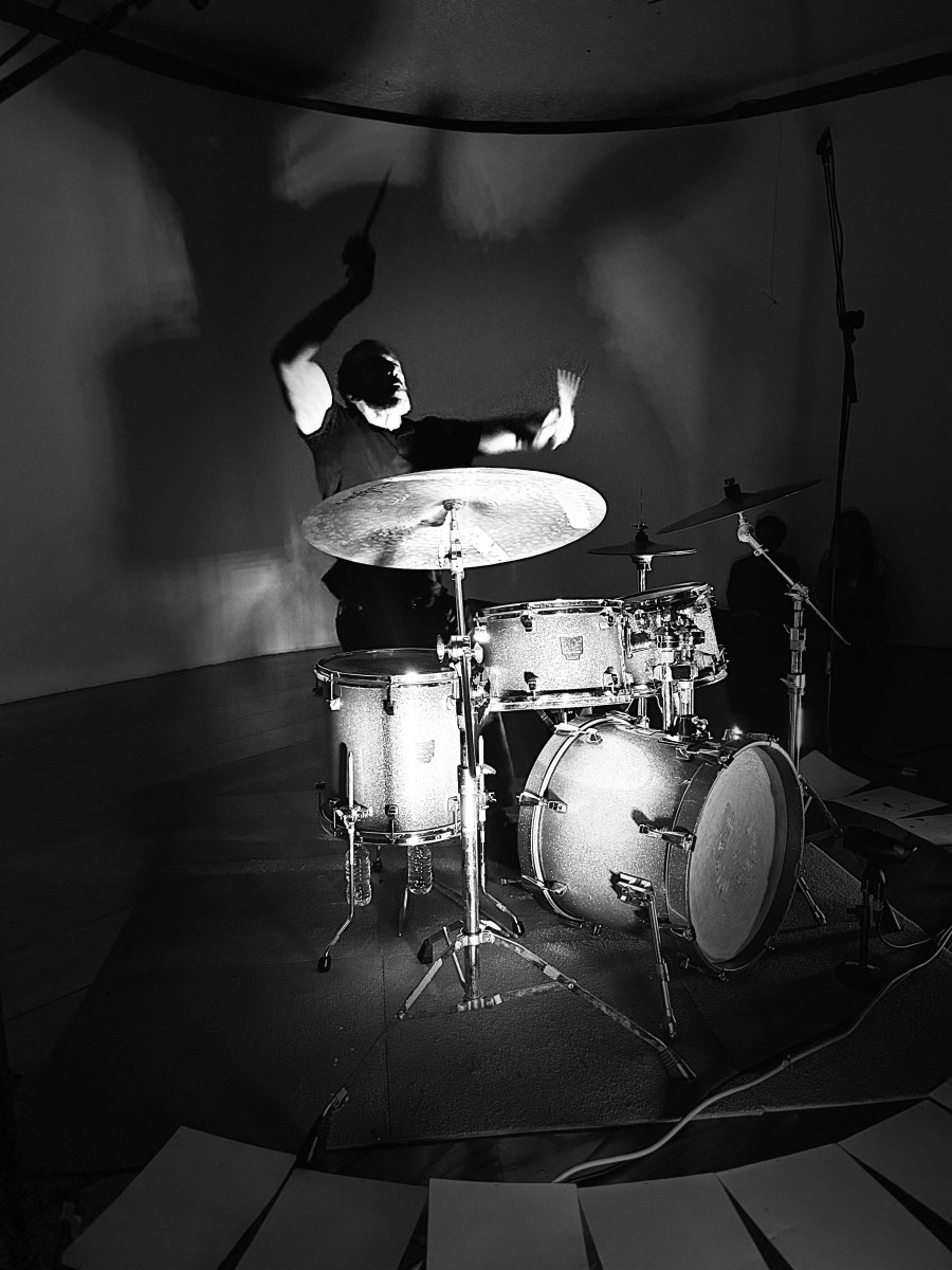 Milo Tamez es un percusionista y es también un investigador muy original, con una curiosidad inmitigable, un interés sobre la dimensión espiritual y fisiológica del cuerpo, las ciencias de la percepción y las teorías acerca del tiempo y el espacio, la naturaleza atómica de la célula y sus vibraciones. Pollock: tambores pintores es uno de los resultados de estas investigaciones, de sus muchas andanzas y lecturas, y es en donde su teoría pasó a ser teorema, presentado en una versión reciente el pasado 12 de octubre, en el Centro Nacional de las Artes, bajo la curaduría de Gonzalo T. Alonso. El día del concierto, en el salón y ante la audiencia, Milo ante su batería, extendiéndose sobre su lienzo, comenzó realizando los movimientos correspondientes del cuerpo para la percusión, las baquetas en las manos, los brazos subiendo y bajando con vigor, el torso girando para recorrer los toms y la tarola, estirándose para alcanzar el platillo, ride y crash, pero sin hacer nunca contacto, sin producir sonido alguno, sólo una muda coreografía estrictamente visual hasta que de pronto, por la naturaleza propia de la cercanía y la potencia de los movimientos, algún accidente, la punta de la baqueta en la mano izquierda alcanzó un disco y la brillantez de un color se expandió por el salón, Milo tomó el accidente y lo cabalgó para ahora sí sonar con la irrupción de un retumbar profundo del bombo para las notas negras, salpicando el contratiempo, lanzando brochazos carmesís marcados por interrupciones sobre el tiempo, con el canto definitivo de los tambores sobre el espacio, para de pronto interrumpirse de nuevo y volver a los puros movimientos en silencio, pero después ya nada fue igual, porque ahora podíamos escuchar los gestos, como en una invocación, los movimientos comenzaron a escucharse metafísicos entre nosotros, como si con el solo tomar un pincel y hacer los brochazos en el aire pudiéramos ver la pintura formarse en la nada, en la conjunción de nuestros oídos internos, en la percusión de nuestros interiores. ¿Es eso la música, la imagen interna de una sutíl sugerencia? En el medio del concierto Milo comenzó a hacer movimientos que no son los usuales de un baterista, movimientos del brazo que caían por fuera del ámbito de las superficies, que se acercaban a agitar la muñeca en el espacio puro, movimientos de la bataca hacia el techo, como picando el cielo, incorporándose para circular el hombro y la mano con la escobilla sobre su cabeza, y nuestra imaginación salió corriendo apresurada a reproducir un sonido imposible que correspondiera, un sonido imposible y perfectamente verosímil. Agitados por el crescendo de un estruendo estrictamente visible, la respiración y los roces de las manos y las cabezas que se inclinaron para escuchar mejor lo que sólo veíamos, la propia palpitación quedó sepultada bajo el estrépito en el remate de una batería que no emitió vibración ninguna y que encontró su eco exacto en el furor de los aplausos, completando la pintura, la imagen estaba hecha.